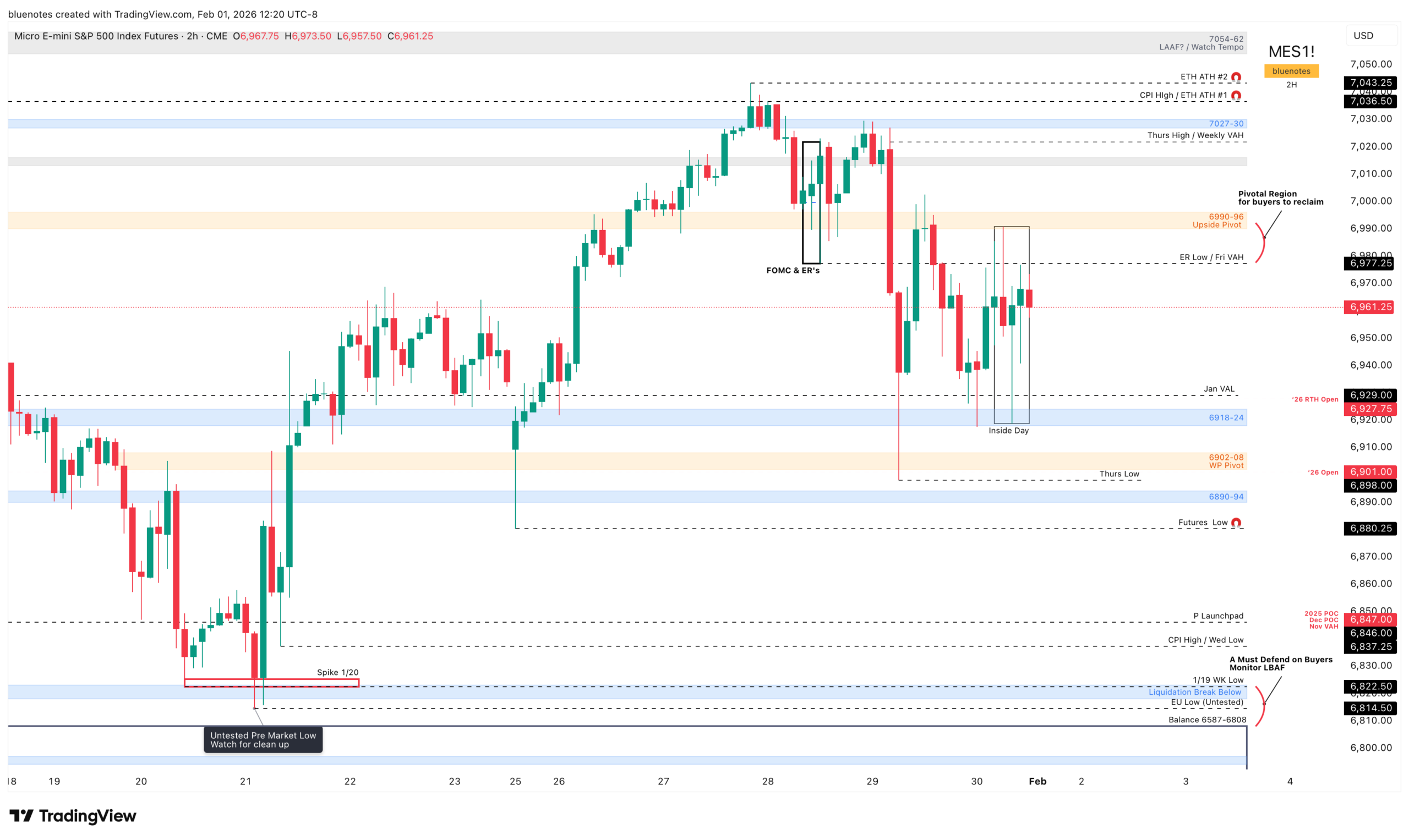 📈Trading Above: Holding above the weekly pivot targets 6918-6924, then Friday’s low / Jan VAL at 6929, followed by Friday’s VAL at ~6940. Continued rotation higher within Friday’s range targets the ER low / Friday VAH at 6977.25 and then 6990–6996 (upside pivot). The FOMC/ER low zone through the upside pivot is a pivotal range for buyers to reclaim and hold. Acceptance above that range puts the ETH ATH magnets back in play.