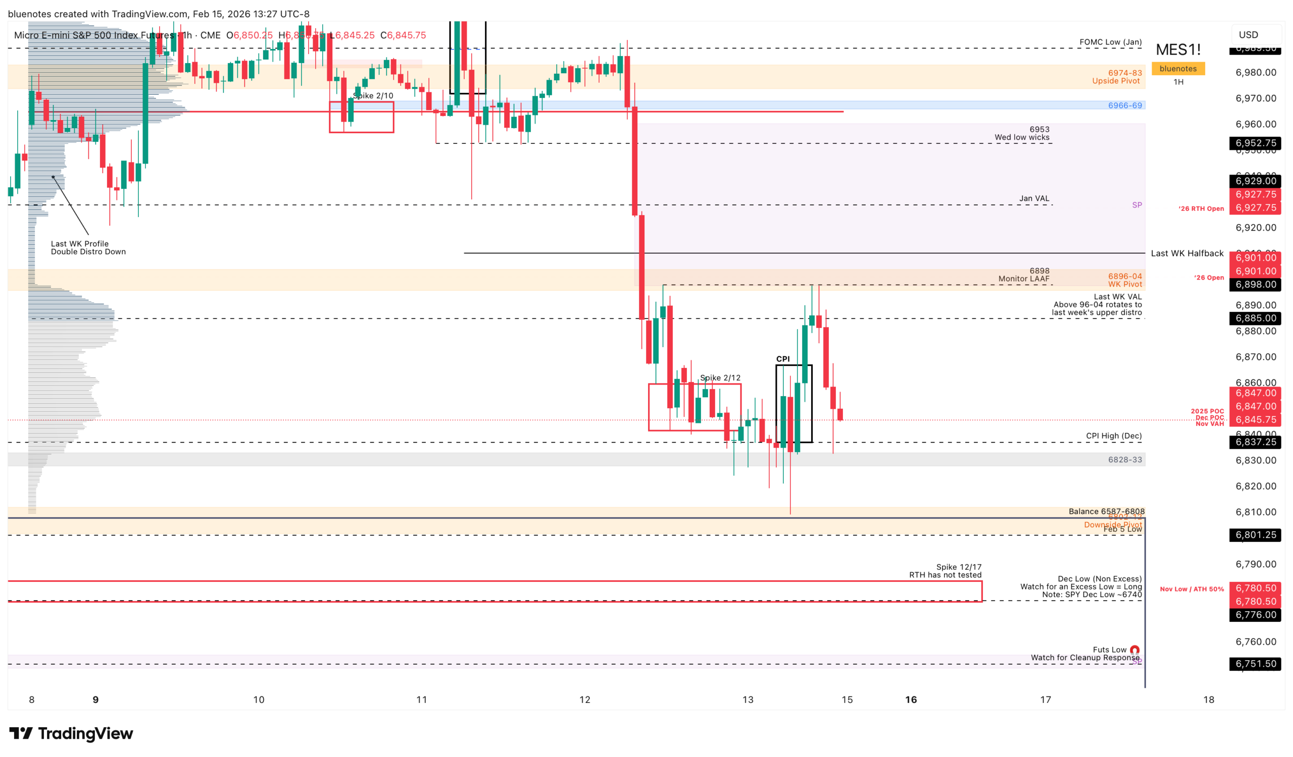 With the profile above being thin, an area we moved through quickly on the way down, price could rotate quickly toward Thursday’s open and the 6966–6969 weekly level. I’d be mindful of 6953, which acted as key support during Wednesday’s cash session and remained important into the following Globex open. Also note that January’s VAL sits roughly mid-way through the single print, making it another possible reaction point.