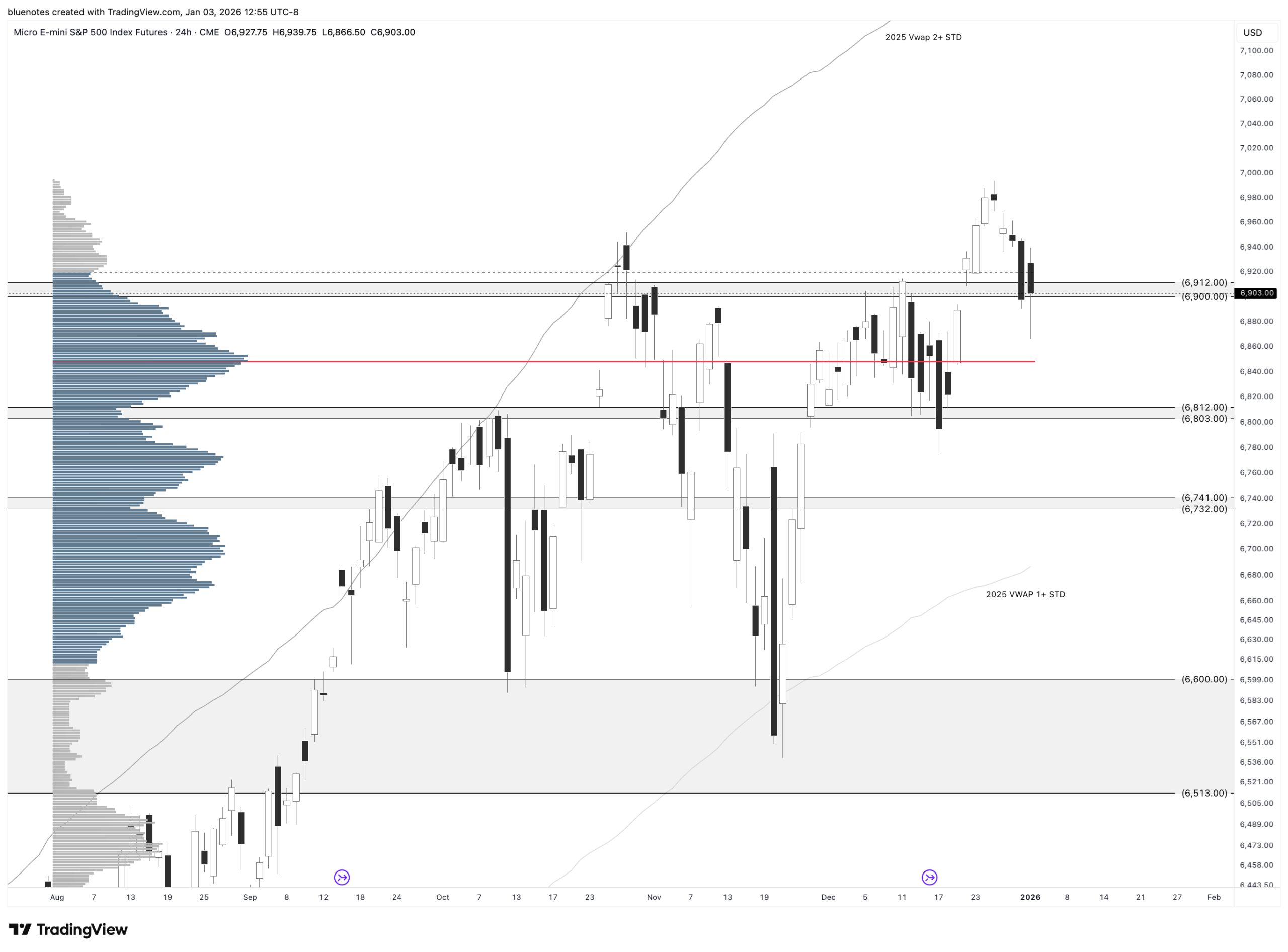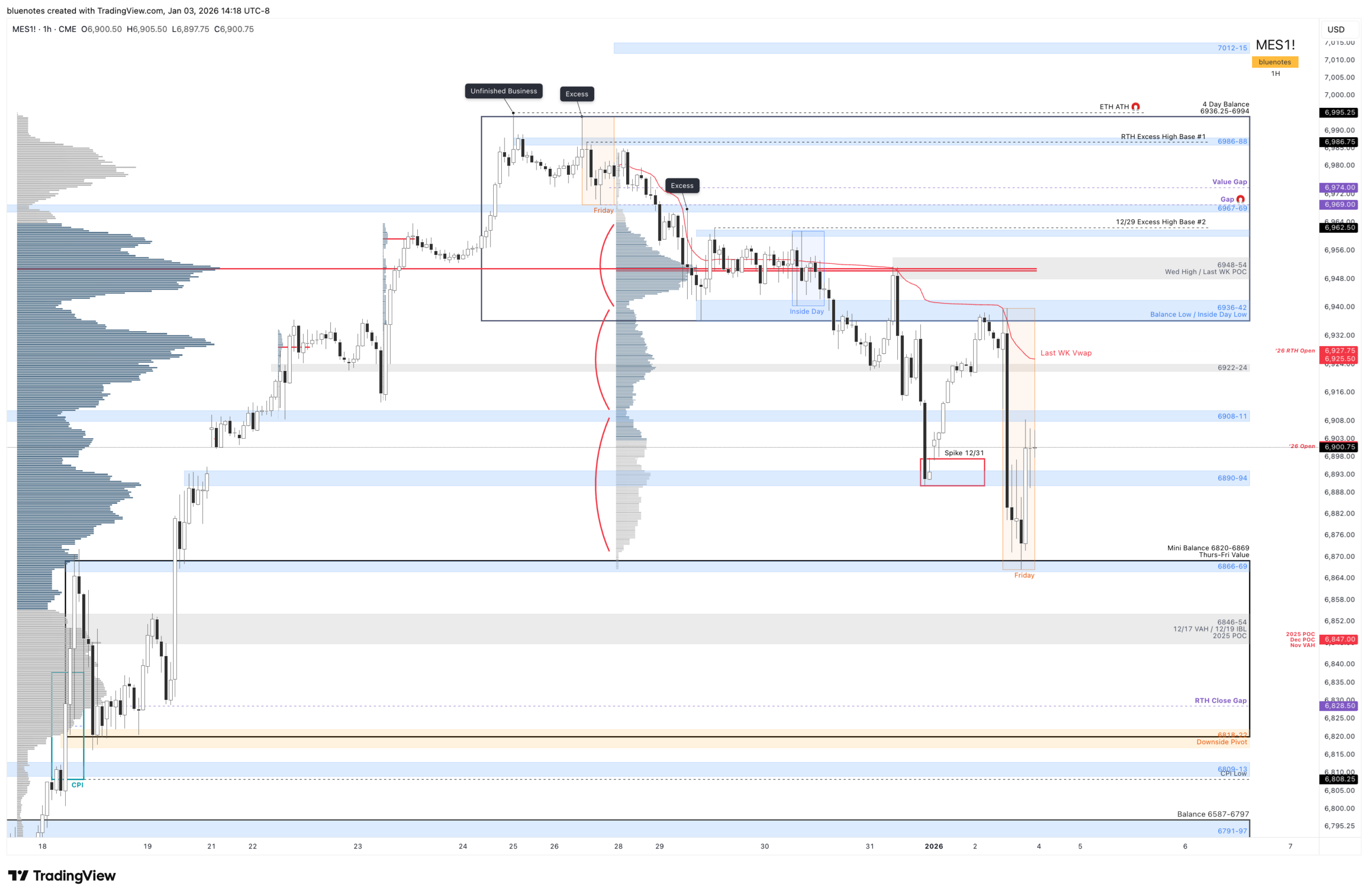 Friday’s high sits within the prior weekly pivot (6936-6942), which also aligns with the lower boundary of the multi-day balance and the lower edge of last week’s upper distribution. Friday’s low aligns with the prior downside pivot and a small balance formed on December 18–19.