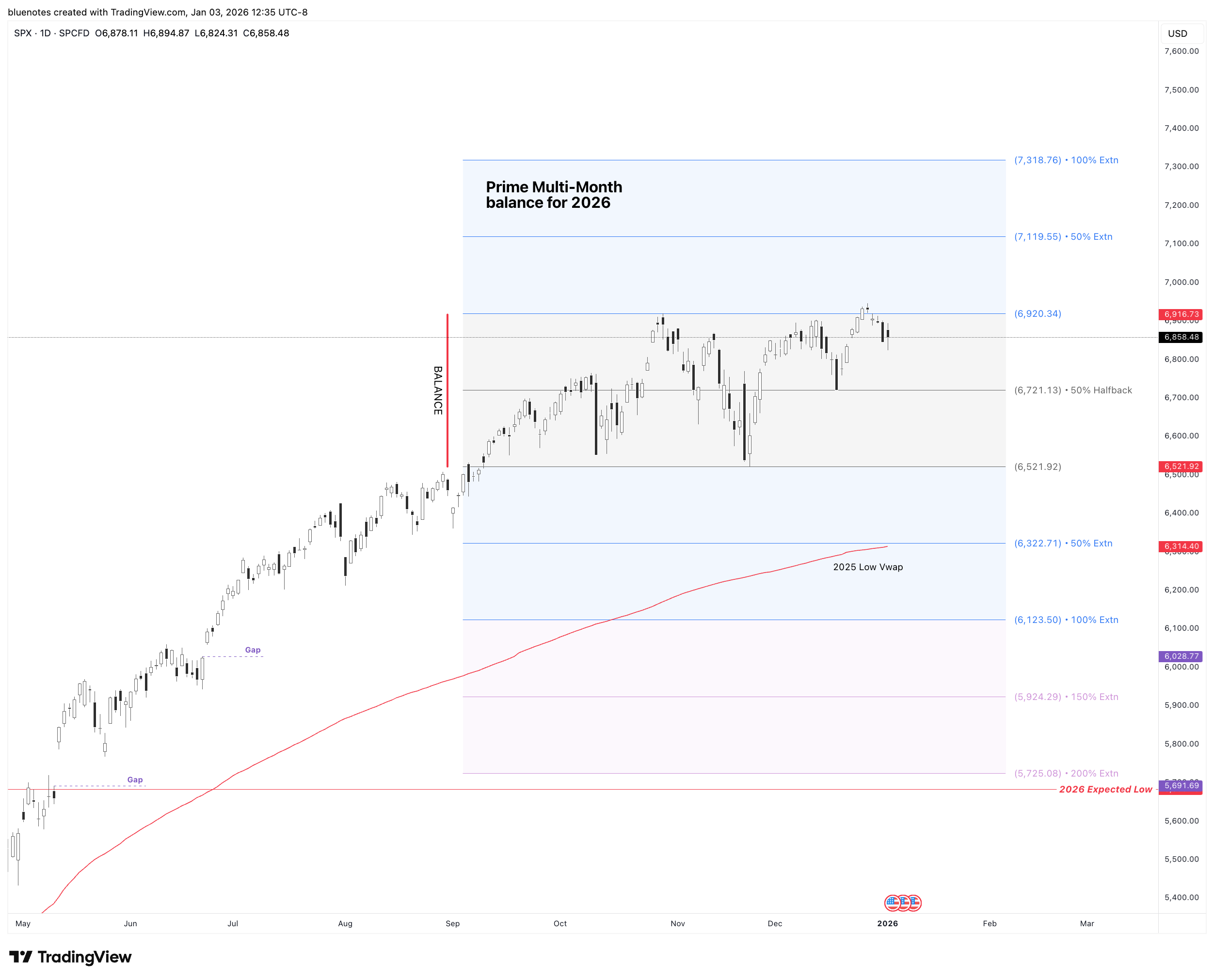 The 2026 Prime multi-month balance will serve as a key framework for the year. Using SPX levels, the first 100% extensions project to approximately 6123 on the downside and 7318 on the upside. The balance itself spans roughly 400 points, with 200-point halfbacks. Notably, the 2025 low VWAP, which has not been tested since April’s higher low, remains an important longer-term reference.