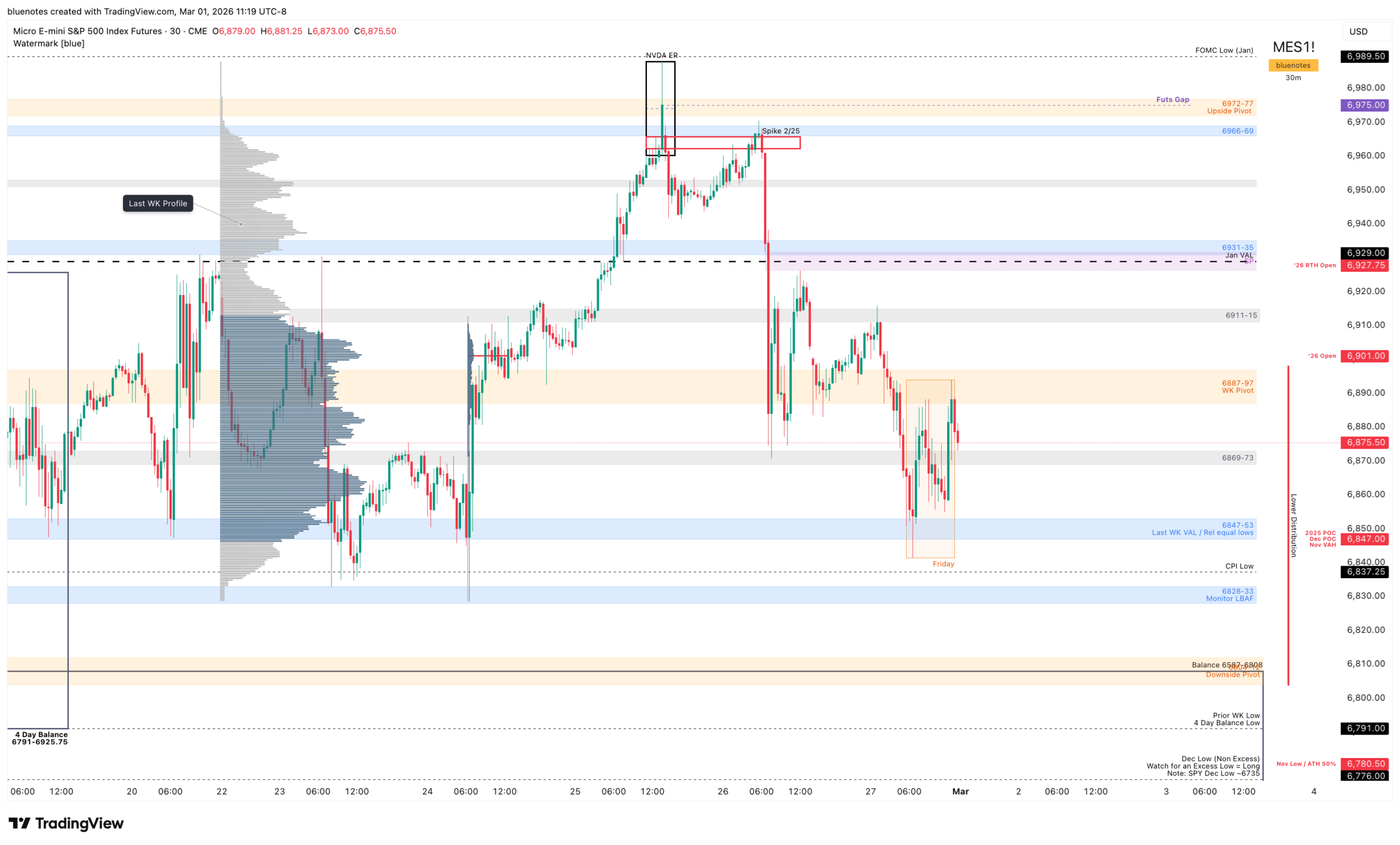 Over the weekend, war-related headlines broke and will likely create some form of gap at Sunday’s open. What matters most is what RTH does on Monday. Unless already positioned short, the priority is simply awareness of the key downside references, especially the broader 6800–6750 zone. For additional context, the December low in SPY roughly maps to about ES 6730’s due to contract decay.