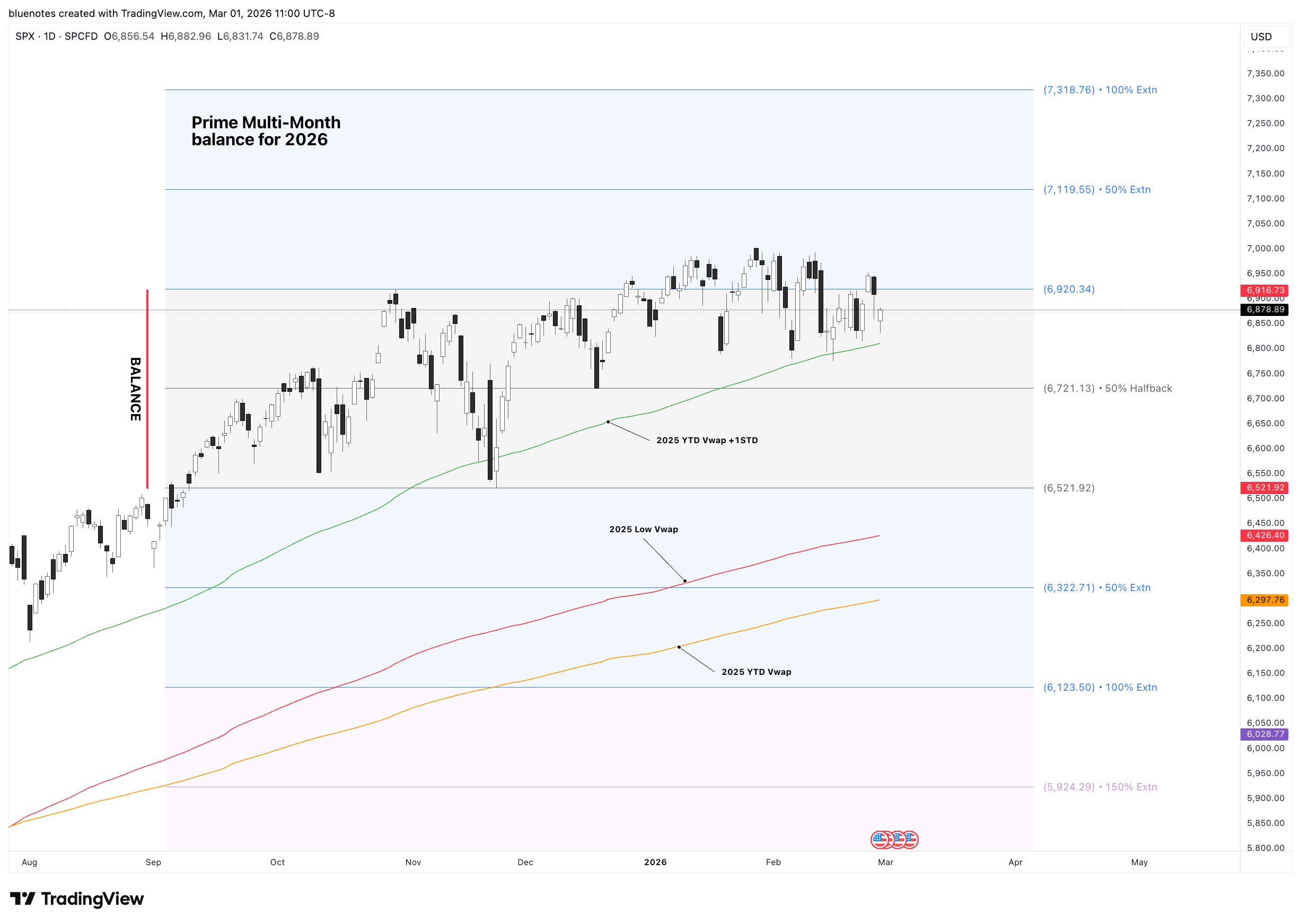 February closed with a notable change in character: ES overlapped and migrated monthly value lower and, importantly, sellers were able to build volume below the 6900s. They were unable to do that in January, but they have accomplished it in February. That shift matters. It also doesn’t require immediate downside follow-through, this can resolve through time as well. The longer consolidation persists, the more meaningful the eventual break is likely to be in either direction.