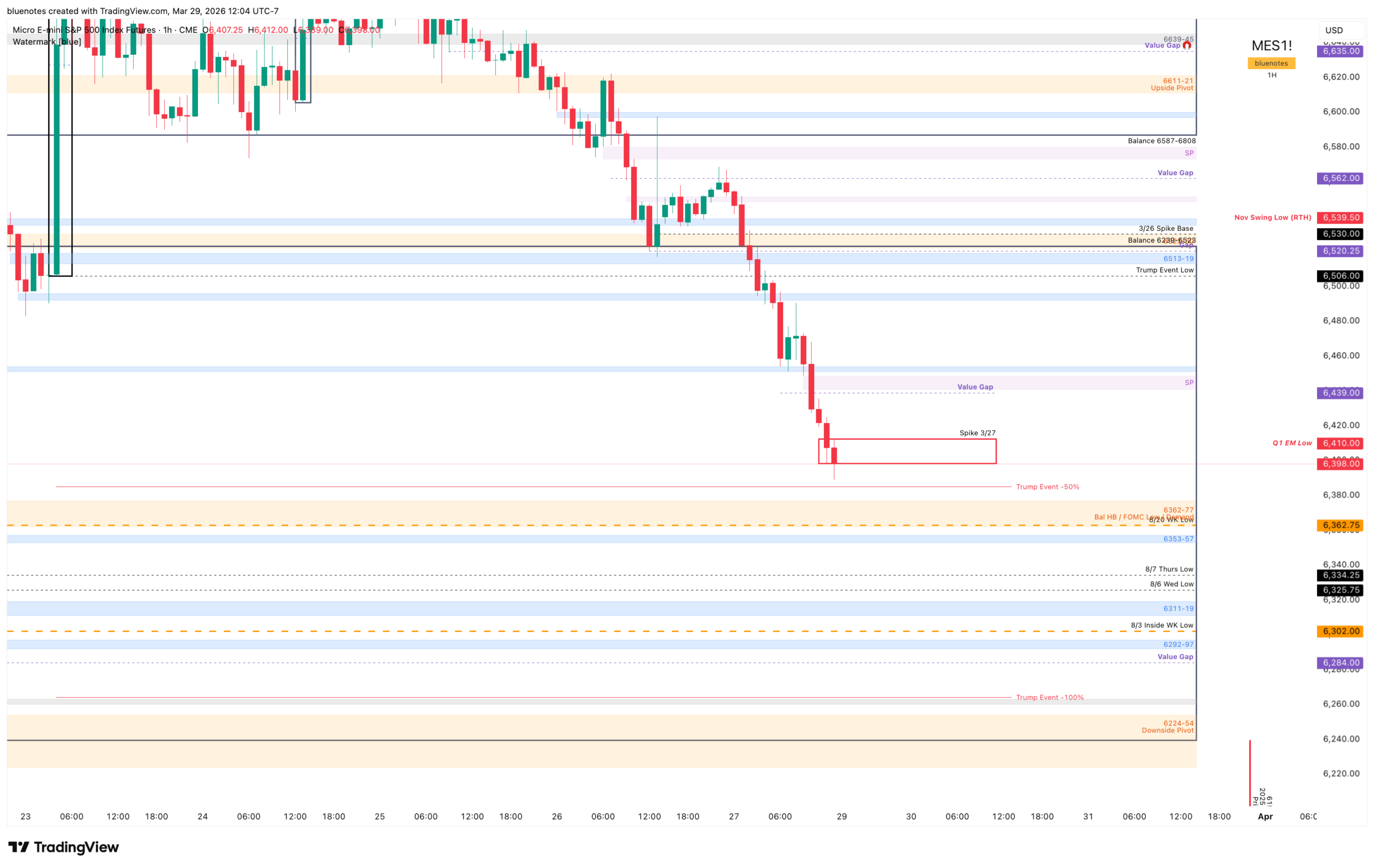 The broader downside target remains the next major yearly range at 6153-6239. That is the area I continue to view as the main destination if weakness persists and also the zone where a more meaningful swing low could potentially form. My lean is that while a bounce directly from here would not be surprising, trading lower first would more likely produce the kind of durable low worth respecting. Said differently, this still does not look like a market that has fully washed out. It may still need some form of capitulation before a better long opportunity presents itself.