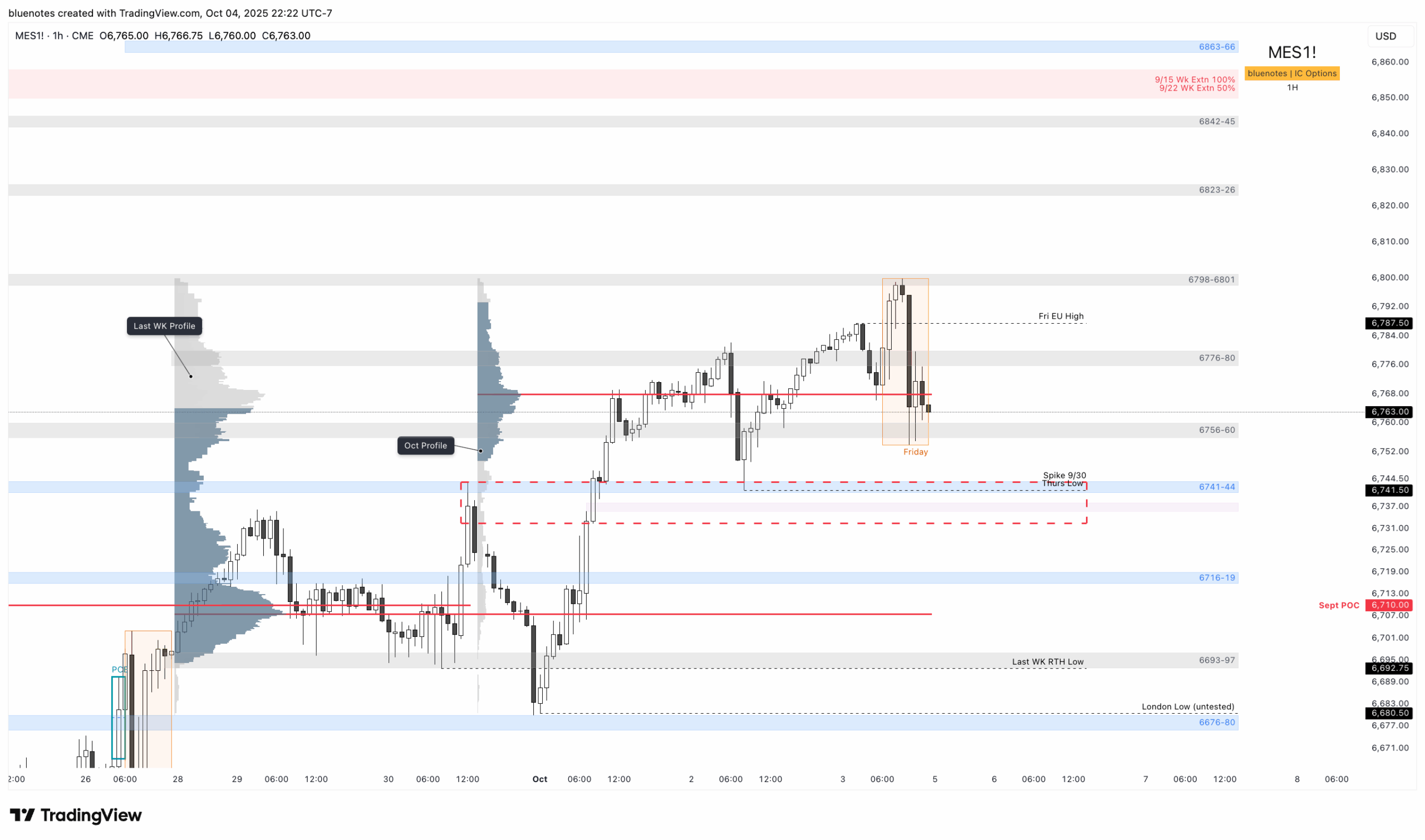 Last week formed a double distribution, anchored by the 6741–6744 weekly level and a remaining single print (6735.75–6738) both part of the September 30th spike up. This structure warrants some caution, especially since the NQ already broke a prior day’s low. If ES takes out Thursday’s low at 6741.5, especially with NQ confirming, it would mark a short-term downtrend.