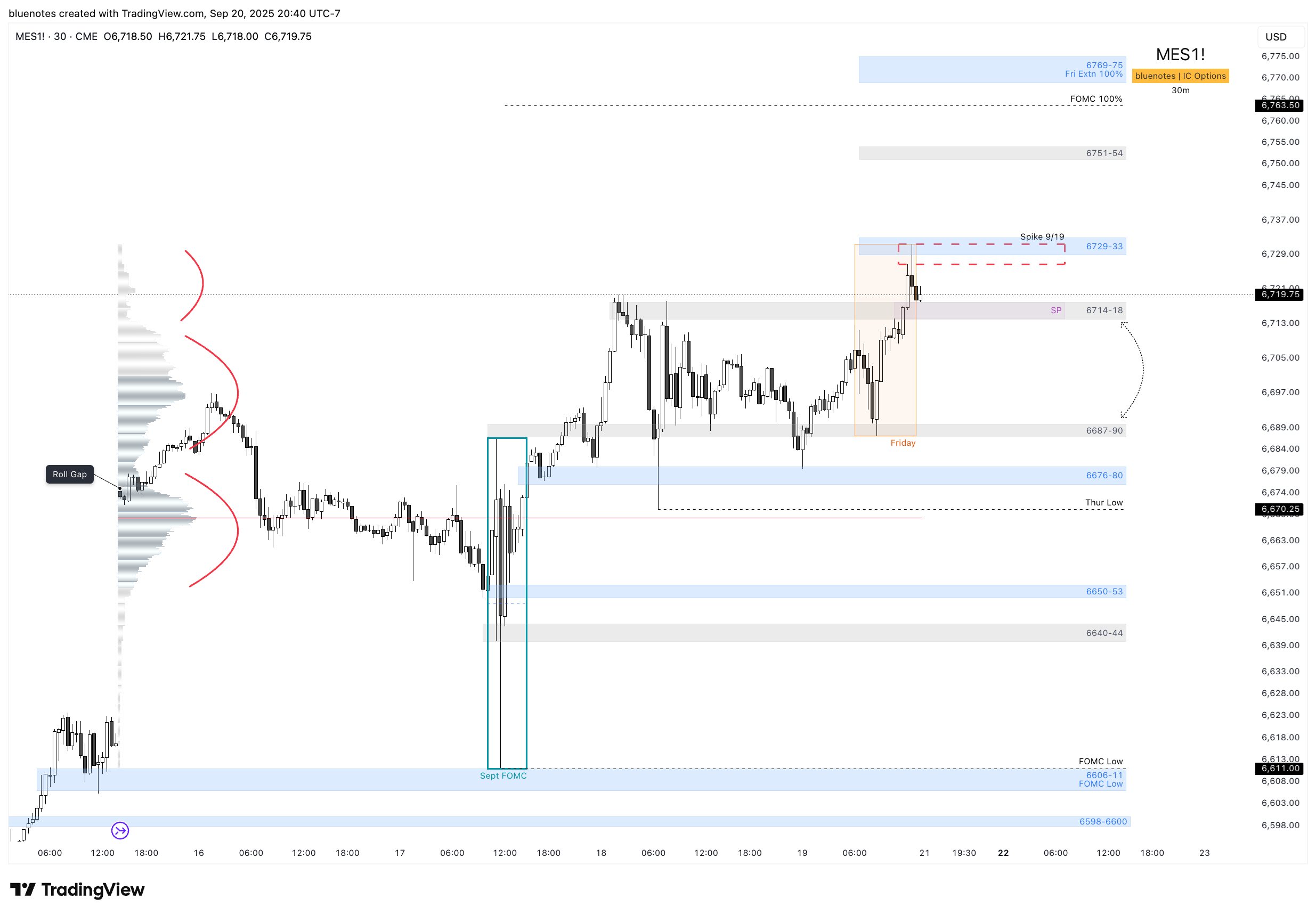 For this week, we’ll use Friday’s range (6687.25–6731.50) as our guide. Friday’s high marks the spike zone (6726.75–6731.50), while Friday’s low aligns with the FOMC high and Thursday’s B-period low. Last week also built a double distribution; buyers will want to defend the lower distribution around the weekly level 6676–80, with Thursday’s low and last week’s POC just beneath.
